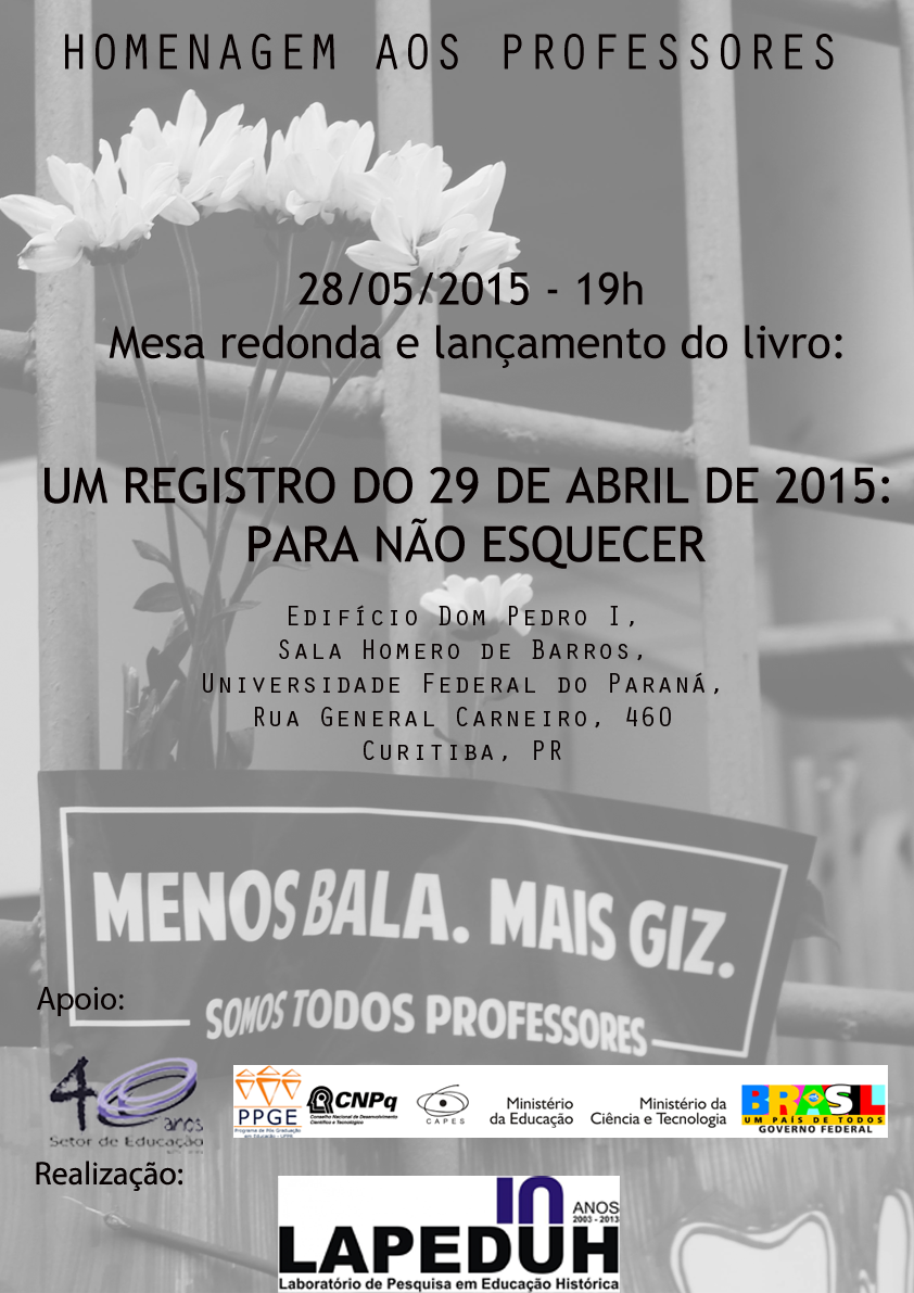 Na quinta-feira, dia 28/05/2015, às 19 horas, na sala Homero de Barros do Edifício Dom Pedro I da Universidade Federal do Paraná, ocorrerá uma mesa-redonda e o lançamento do livro “UM REGISTRO DO DIA 29 DE ABRIL DE 2015: PARA NÃO ESQUECER”, data em que os professores do Paraná sofreram uma ação violenta da polícia militar e do governador Carlos Alberto Richa.