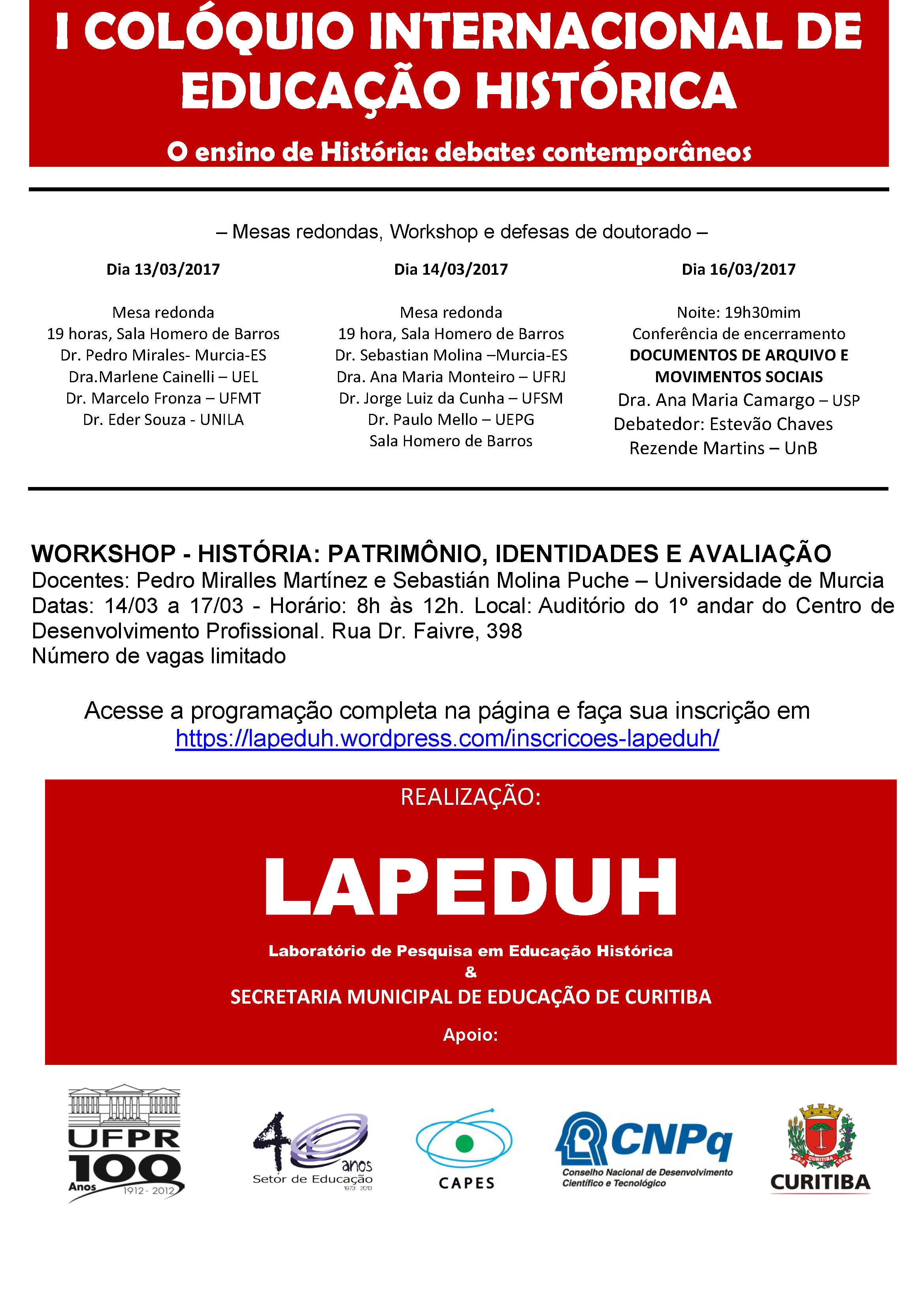 Entre os dias 13 e 17 de março de 2017, o Laboratório de Pesquisa em Educação Histórica terá atividades com certificação aos participantes. Aproveitando a presença dos convidados externos das 4 defesas de doutoramento orientadas pela professora Maria Auxiliadora Schmidt, organizamos mesas redondas, um workshop com professores espanhóis, e conferências e debates com intelectuais reconhecidos na área da História e da Didática da História.