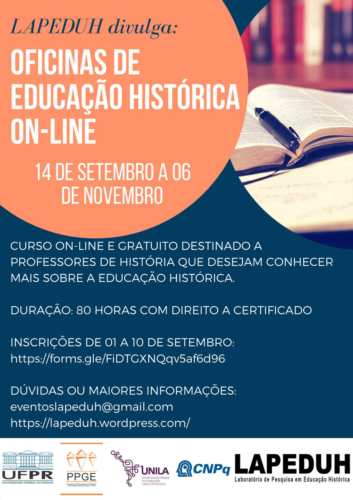 O Laboratório de Pesquisa em Educação Histórica – LAPEDUH, do Programa de Pós-graduação em Educação da UFPR, está promovendo um curso online e totalmente gratuito para professores de História! As oficinas são organizadas com o objetivo de ampliar o alcance da Educação Histórica numa formação continuada que pretende valorizar os professores como pesquisadores e produtores de conhecimento.