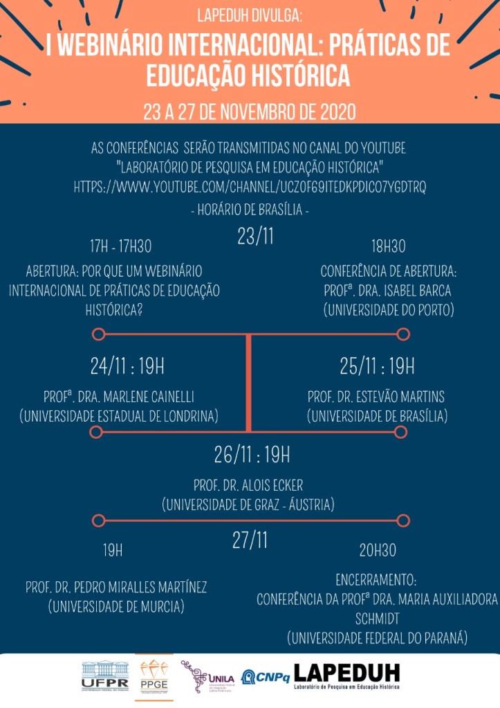 Entre os dias 23 e 27 de novembro de 2020 o Laboratório de Pesquisa em Educação Histórica da Universidade Federal do Paraná (LAPEDUH-UFPR) promove o I Webinário Internacional: Práticas de Educação Histórica, com conferências disponibilizadas em seu canal no YouTube.
