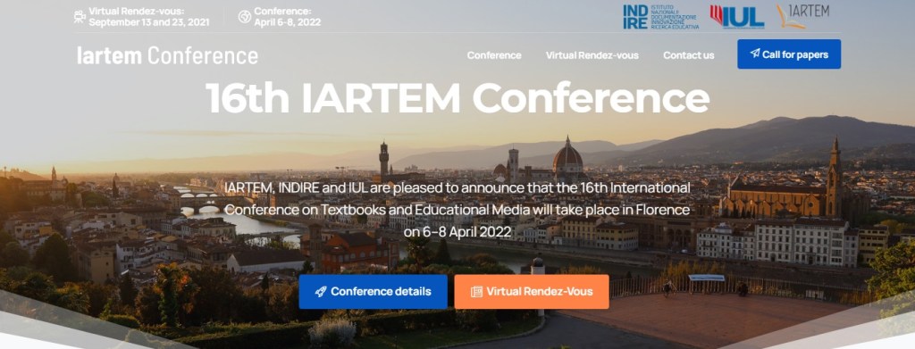 2ª chamada de artigos: 16ª conferência IARTEM em Florença 6–8 de abril: Novo prazo 31 de outubro. O tema da conferência é: Conhecimento e habilidades disciplinares e transdisciplinares para um futuro incerto: a mídia educacional está à altura disso? A conferência será aberta para profissionais de todo o mundo que trabalham na área de livros didáticos e pesquisa e desenvolvimento de mídia educacional. Mais informações: