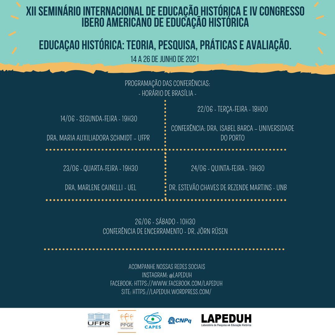 O Laboratório de Pesquisa em Educação Histórica da Universidade Federal do Paraná (LAPEDUH-UFPR) informa que o XII SEMINÁRIO INTERNACIONAL DE EDUCAÇÃO HISTÓRICA E IV CONGRESSO IBERO AMERICANO DE EDUCAÇÃO – Educação Histórica: Teoria, Pesquisa, Práticas e Avaliação será realizado no período de 14 a 26 de junho de 2021.
