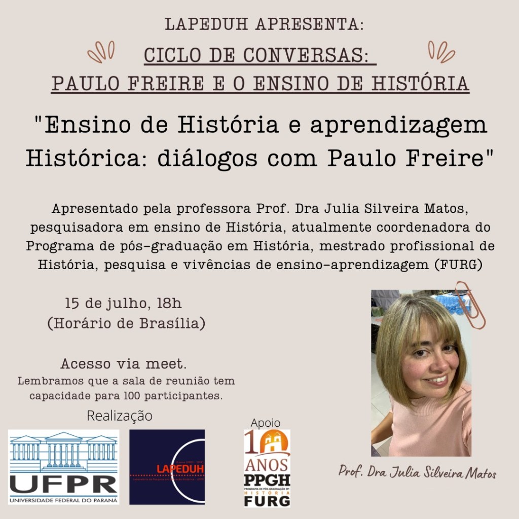 Dando sequência aos diálogos com o pensamento de Paulo Freire, o LAPEDUH convidou a professora Doutora Julia Silveira Matos da FURG para o dia 15/07/2021 às 18h. Informações de participação do Google Meet – Link da videochamada: https://meet.google.com/gwa-auvw-pqy