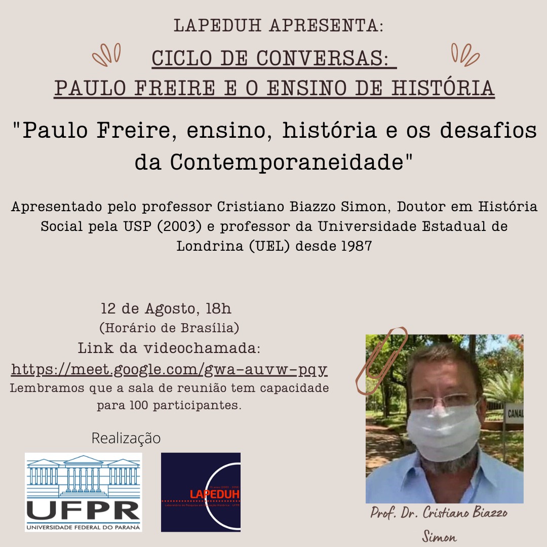 No dia 12/08/2021 teremos mais uma edição do Ciclo de conversas “Paulo Freire e o Ensino de História” organizado pelo LAPEDUH – UFPR. Ajude a divulgar e compareça!!