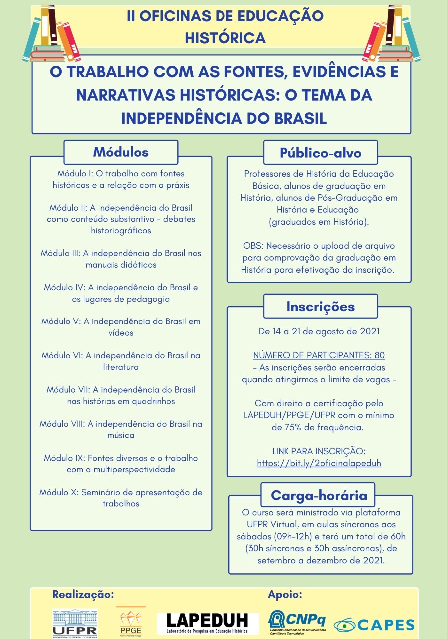 O Laboratório de Pesquisa em Educação Histórica da Universidade Federal do Paraná (LAPEDUH-UFPR) promove a II Oficina de Educação Histórica, intitulada “O Trabalho com as Fontes, Evidências e Narrativas Históricas: o tema da Independência do Brasil”, na modalidade on-line, no período de setembro a dezembro de 2021.