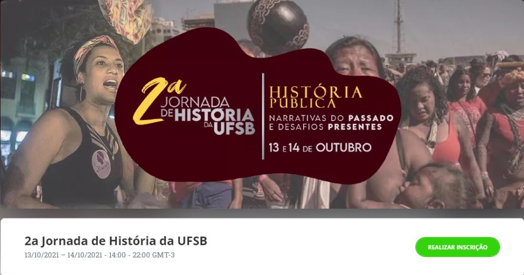 É com imensa alegria que entramos em contato para comunicar o início da divulgação oficial da 2ª Jornada de História da UFSB: História Pública: narrativas do passado e desafios presentes, 13 e 14 de outubro de 2021. O evento será realizado remotamente, com transmissão aberta pelo Youtube, e oferecerá certificado de participação.