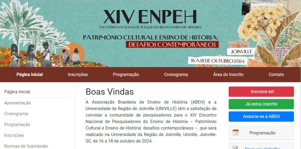 A Associação Brasileira de Ensino de História (ABEH) e a Universidade da Região de Joinville (UNIVILLE) têm a satisfação de convidar a comunidade de pesquisadores para o XIV Encontro Nacional de Pesquisadores do Ensino de História – Patrimônio Cultural e Ensino de História: desafios contemporâneos –, que será realizado na Universidade da Região de Joinville, Univille, Joinville-SC, de 16 a 18 de outubro de 2024.