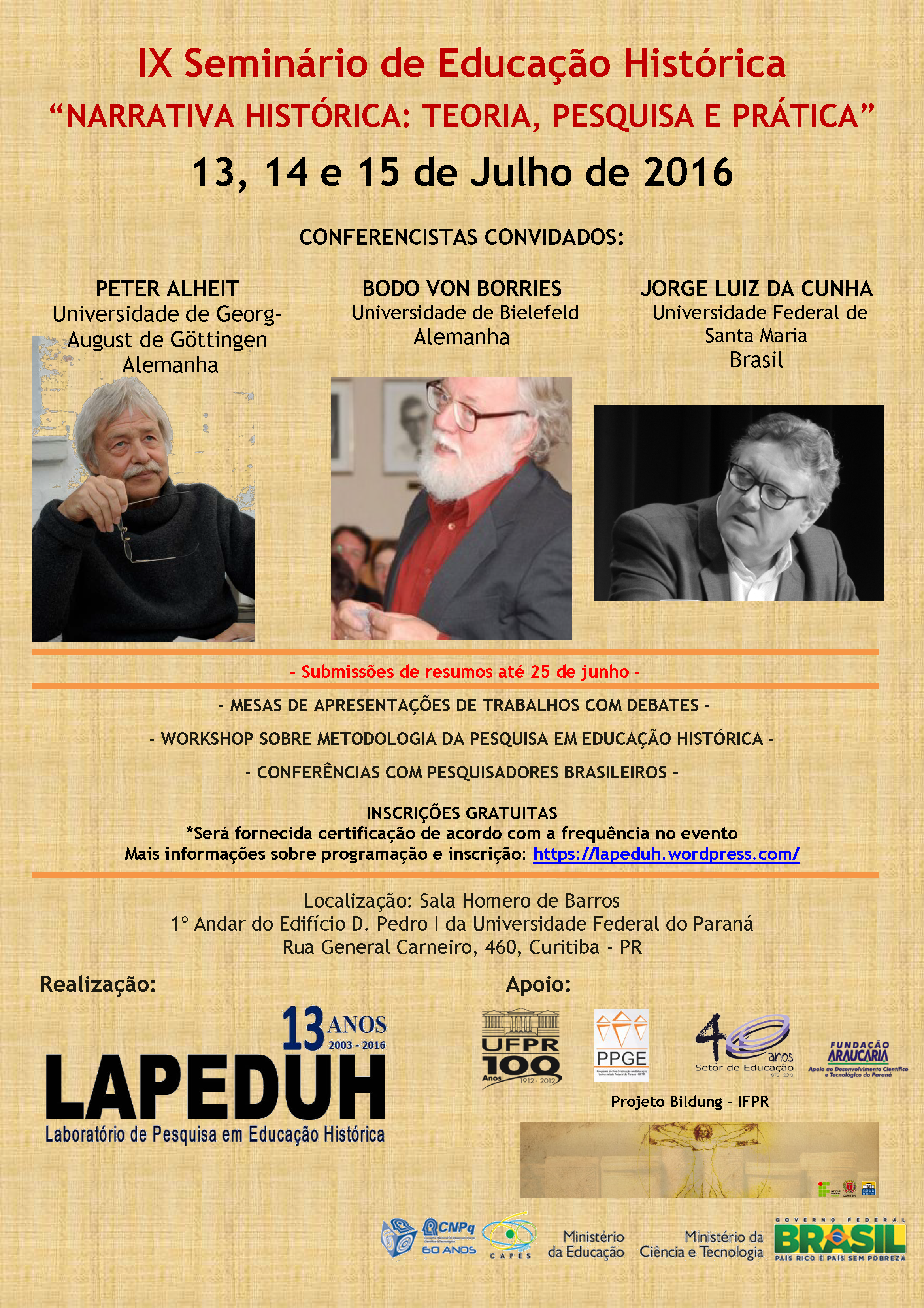 - Mesa 7 – Epistemologia e Educação Histórica (Debatedores: Maria Auxiliadora Schmidt; Marlene Cainelli; Luciano de Azambuja; e Marcelo Fronza)