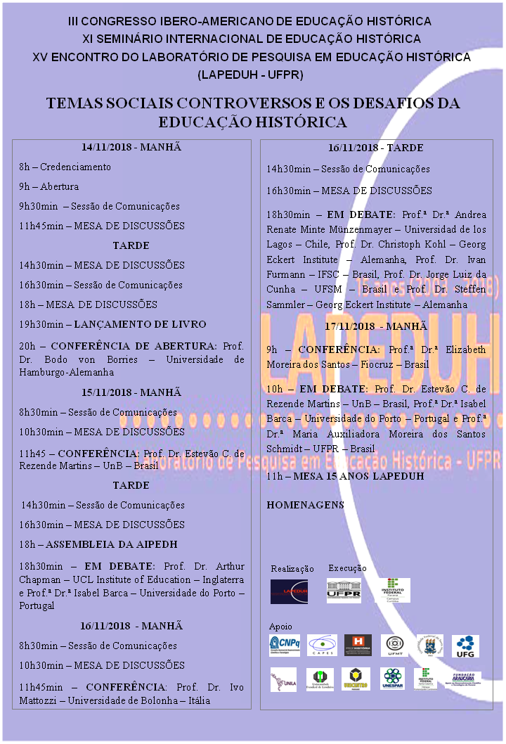 Programação para o III Congresso Ibero-Americano de Educação Histórica, o XI Seminário Internacional de Educação Histórica e o XV Encontro do Laboratório de Pesquisa em Educação Histórica (LAPEDUH-UFPR)
